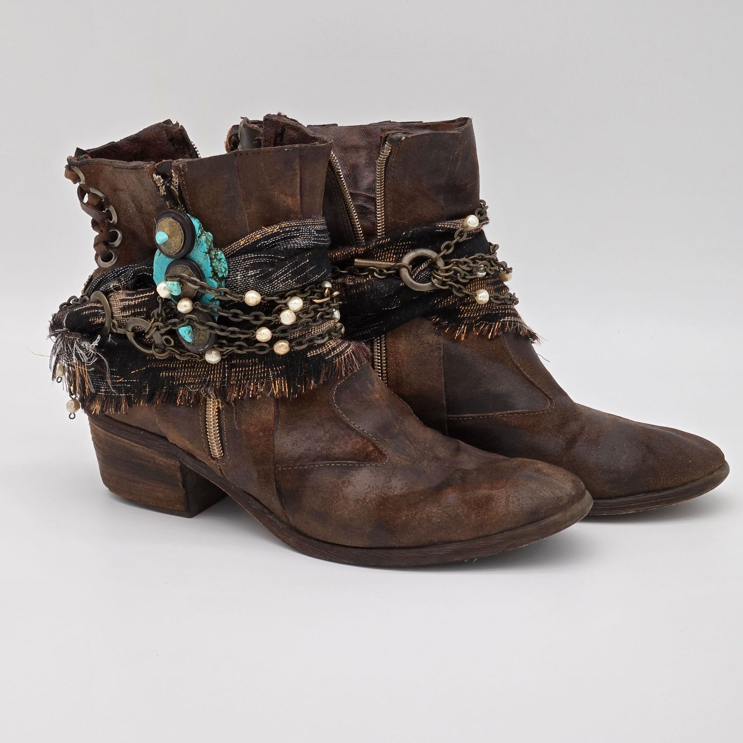 These boots offer a unique boho western aesthetic with distressed leather and detailed accents like chains, pearls, and turquoise embellishments. Comfortable with side zippers and lace-up back for a custom fit. Size 10M