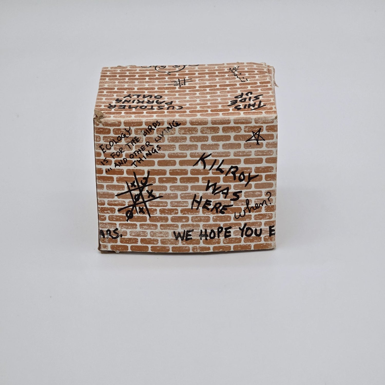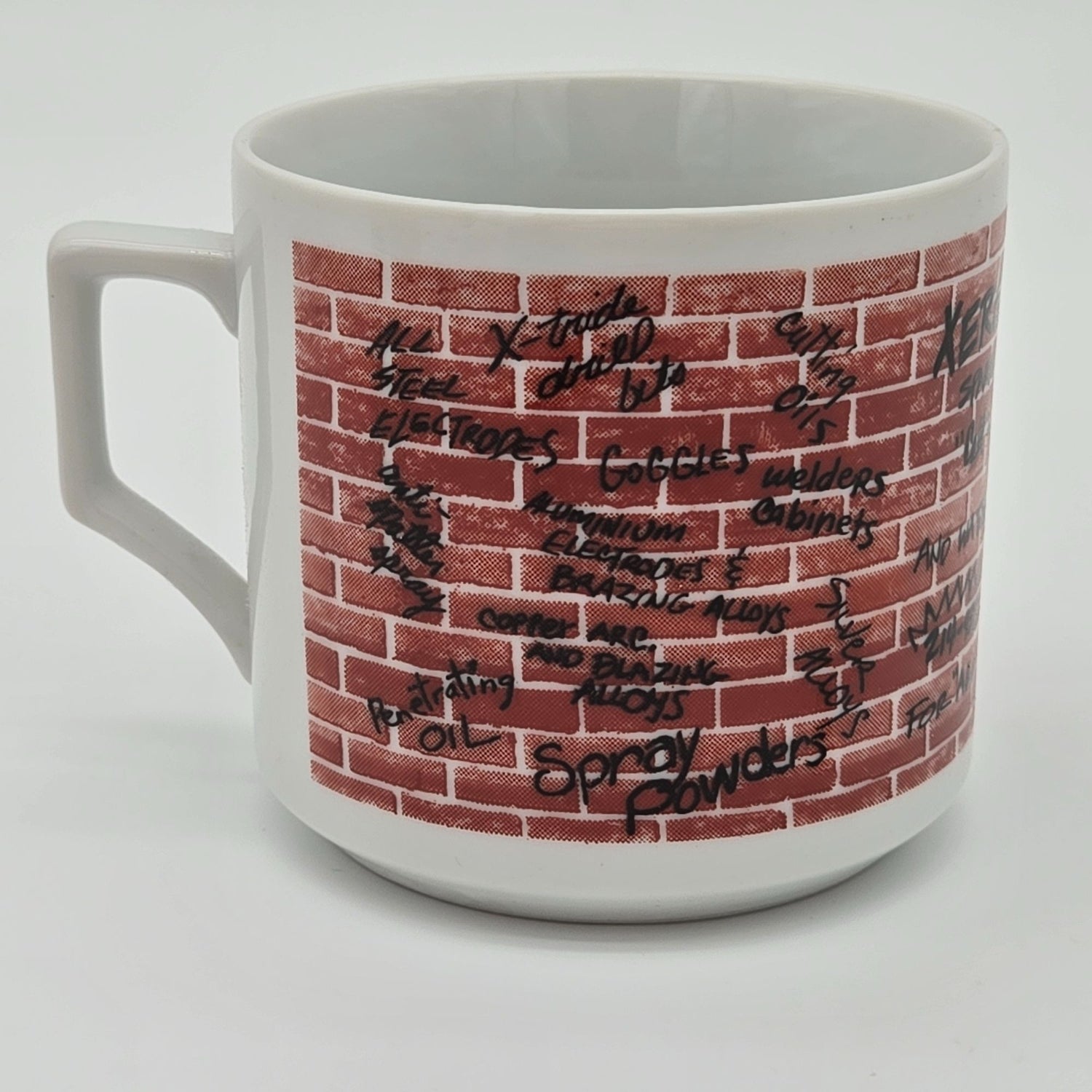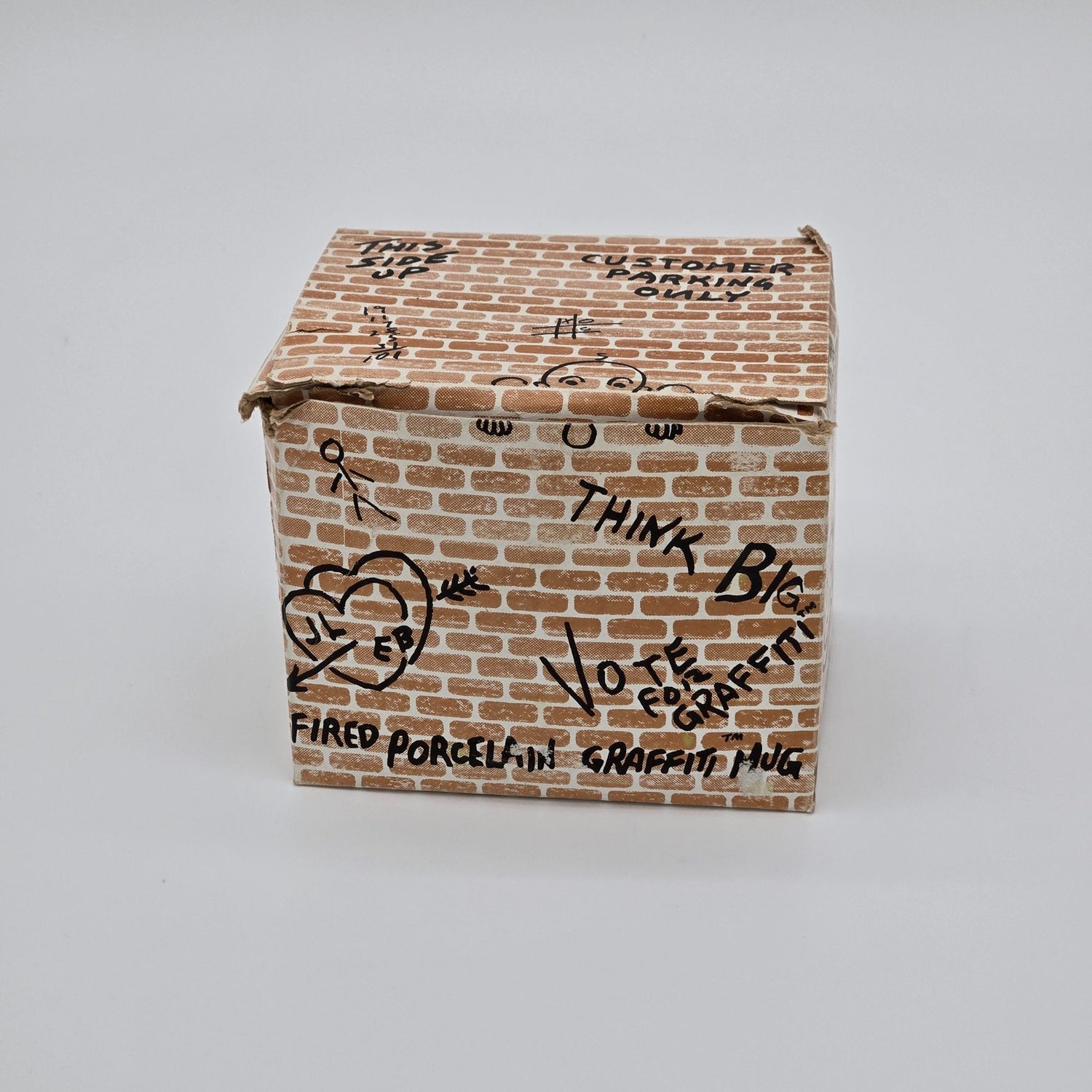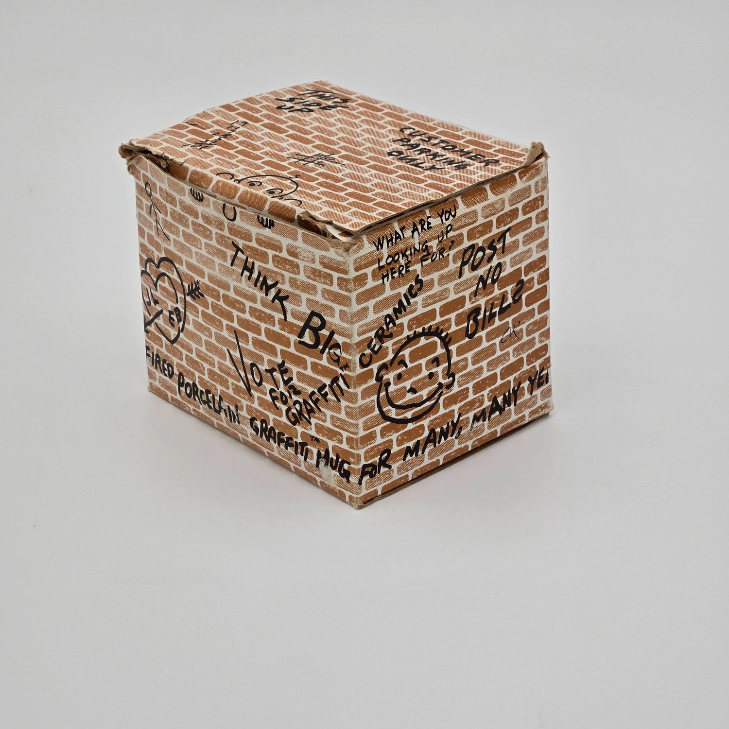 A sturdy fired porcelain mug showcasing a brick wall design with graffiti-style doodles. Ideal for coffee, tea, or displaying as a quirky collectible.