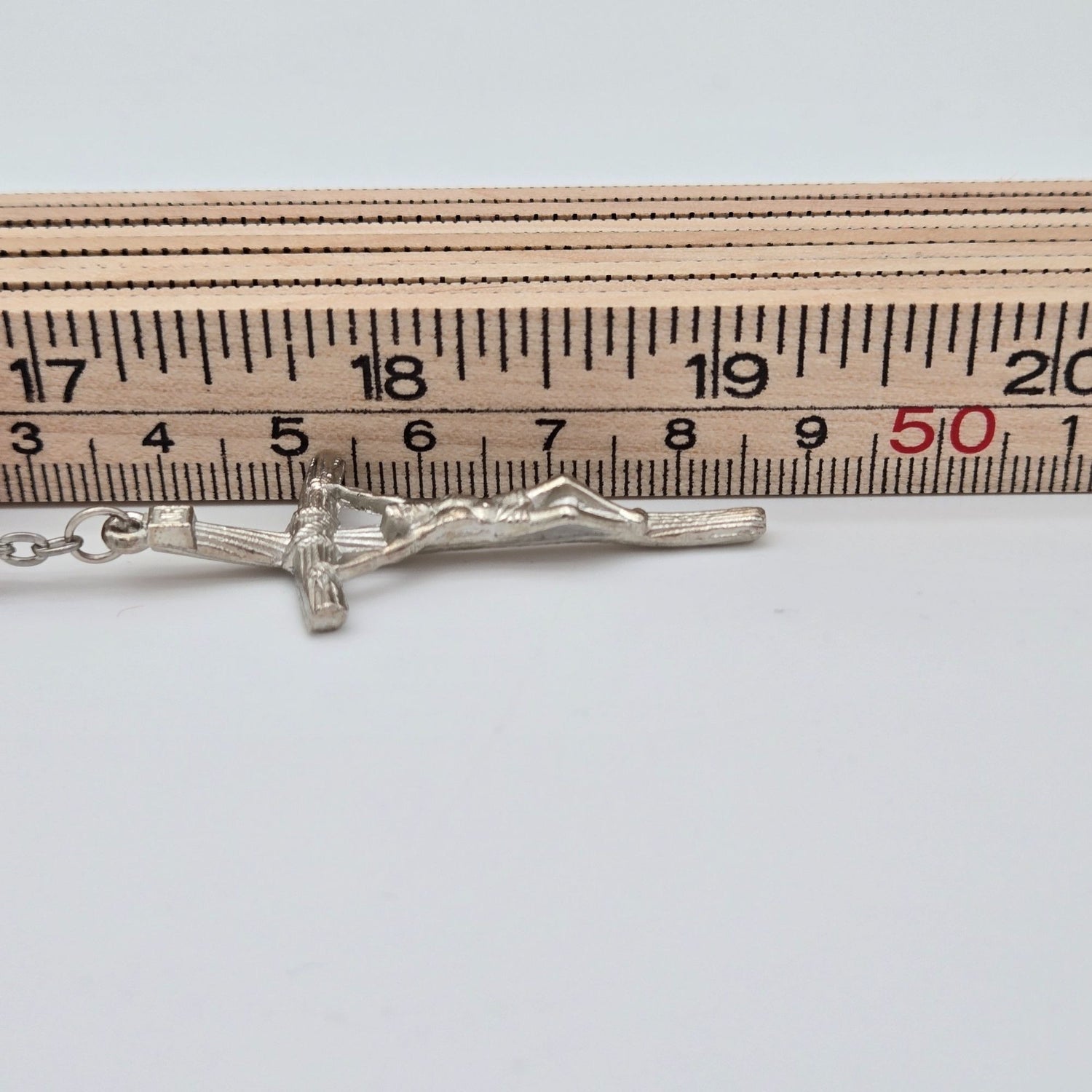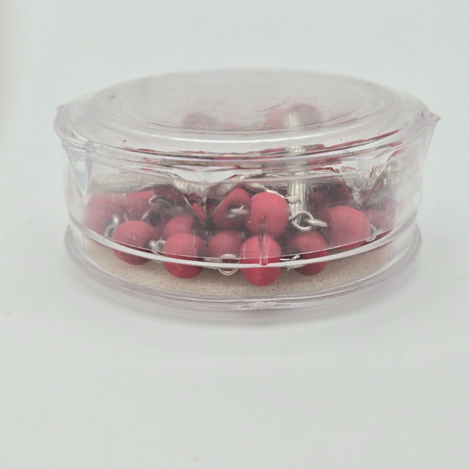 This rosary necklace showcases red wood beads and a silver-tone crucifix with a Virgin Mary centerpiece, blending tradition with elegance.