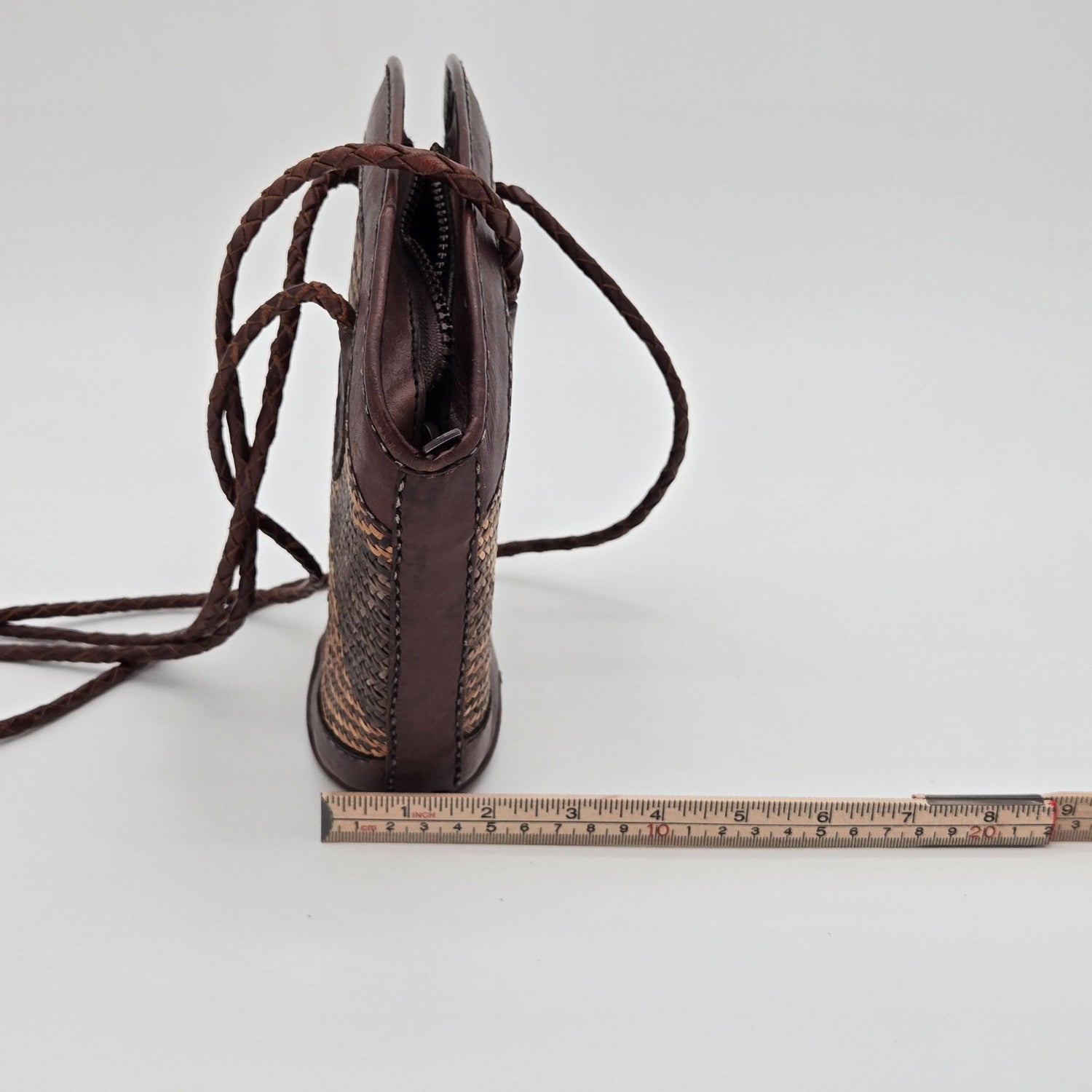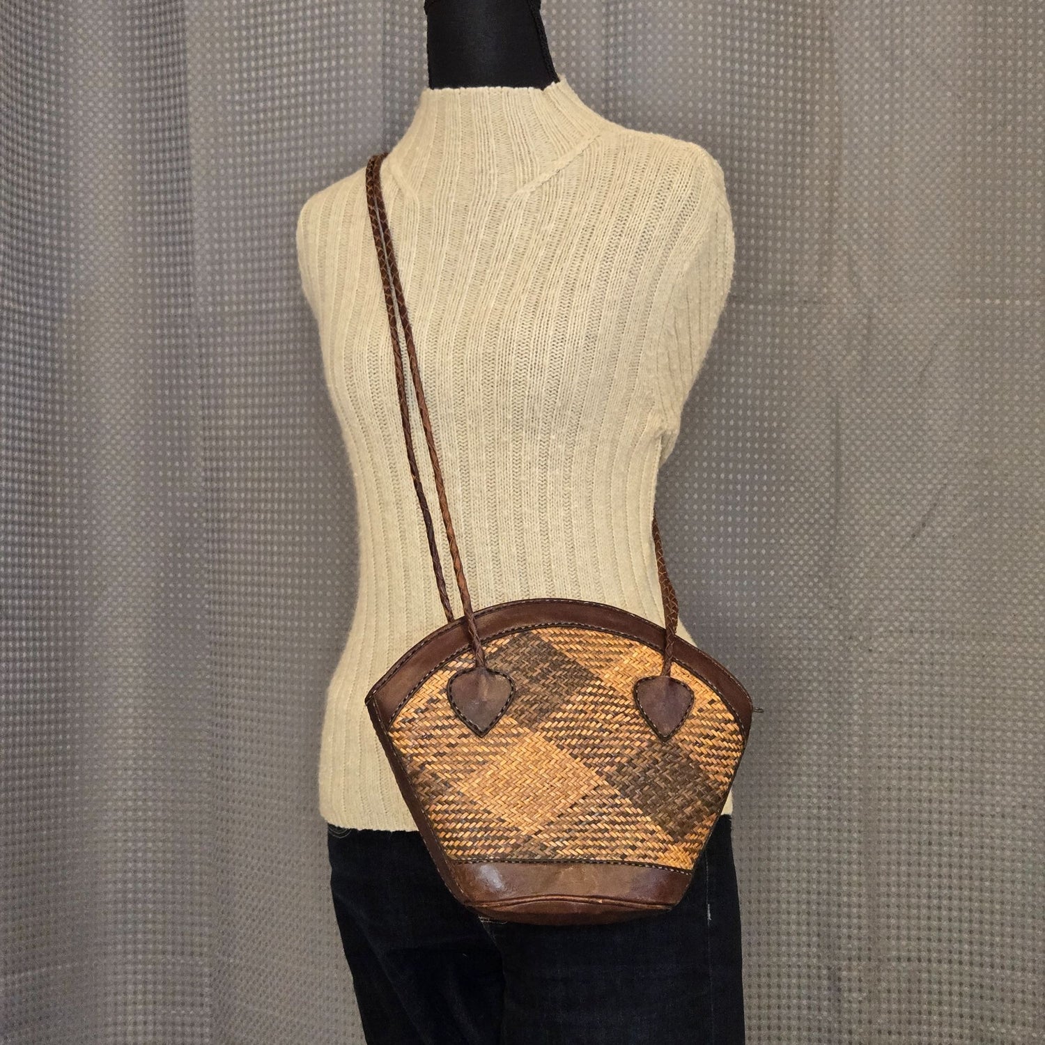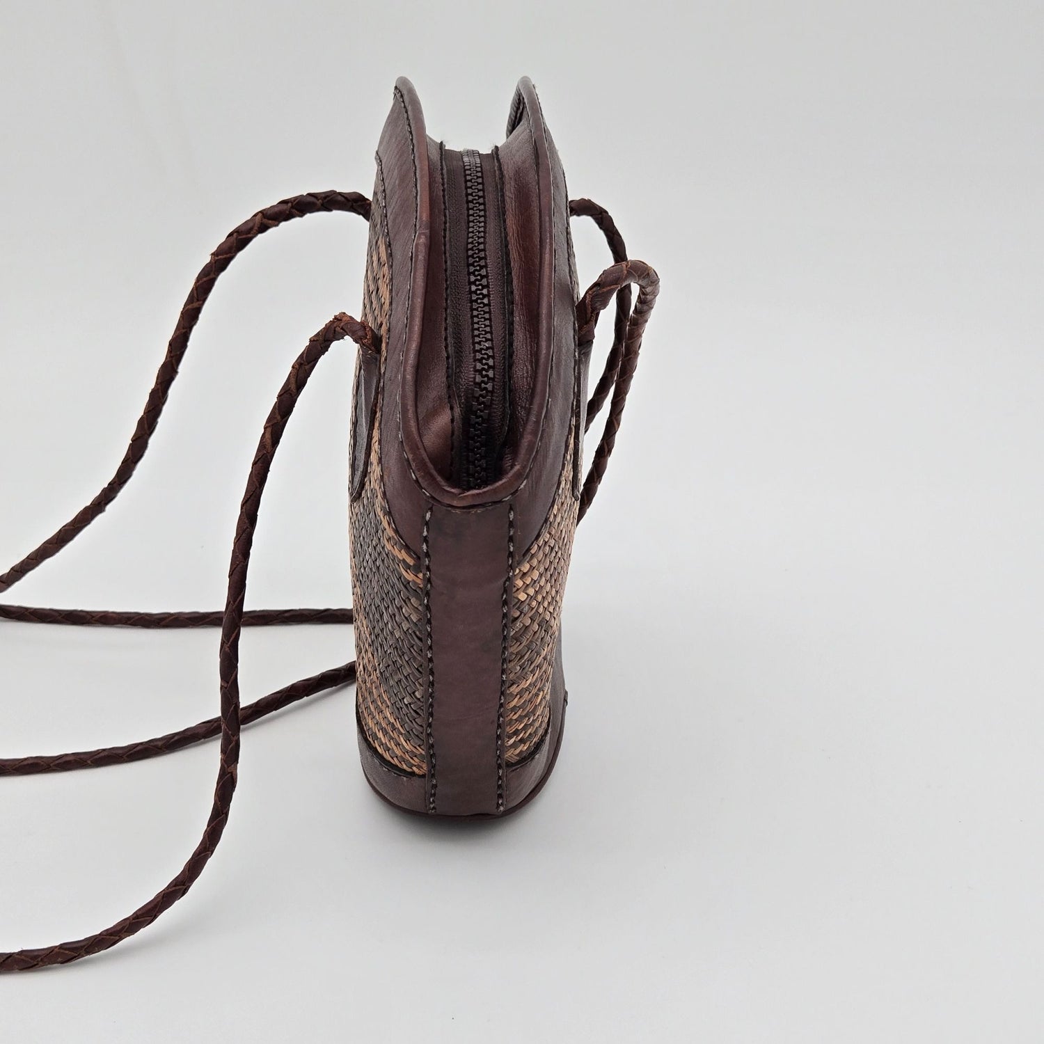 Handmade Indonesian Caneweave Woven Straw & Leather Crossbody Bag With Zipper Closure