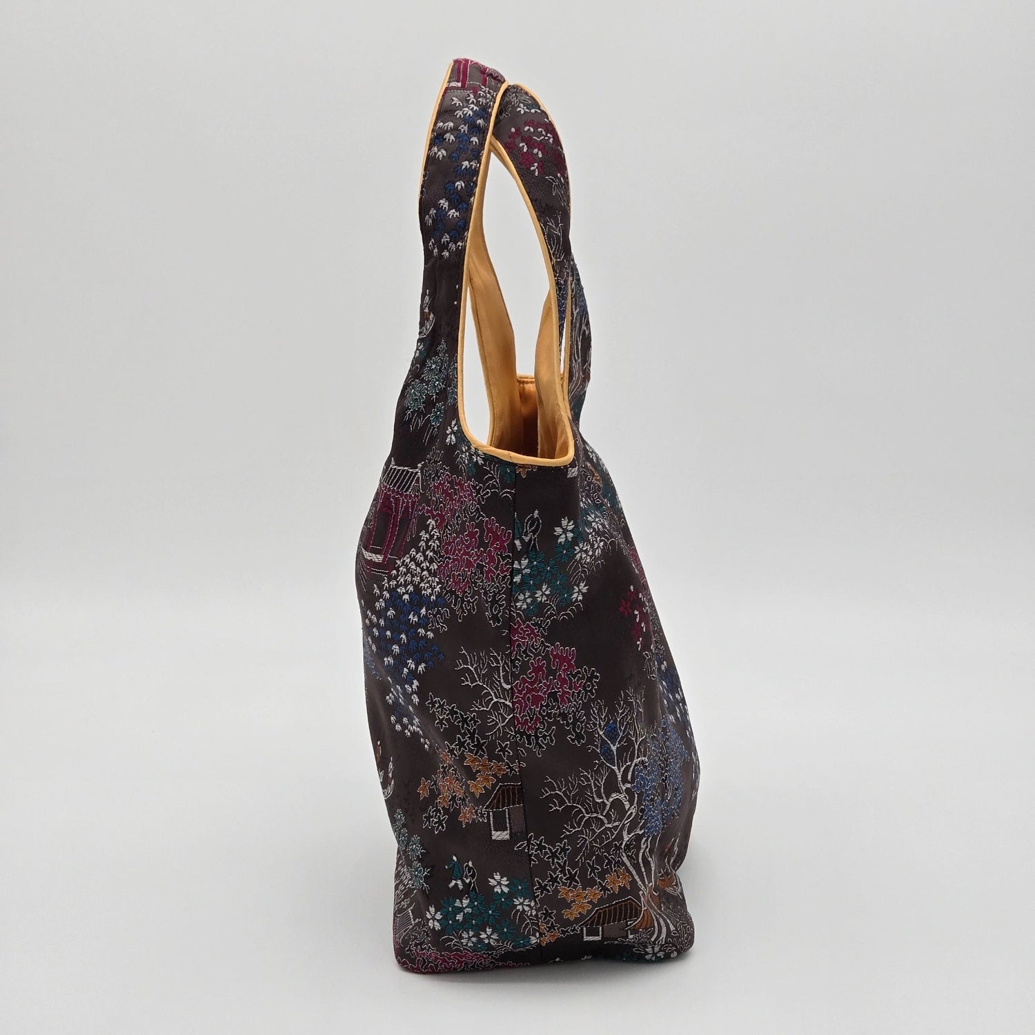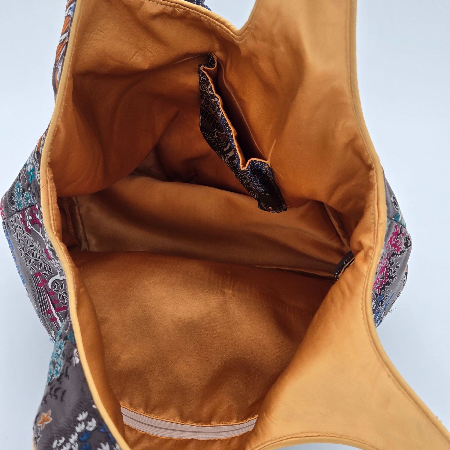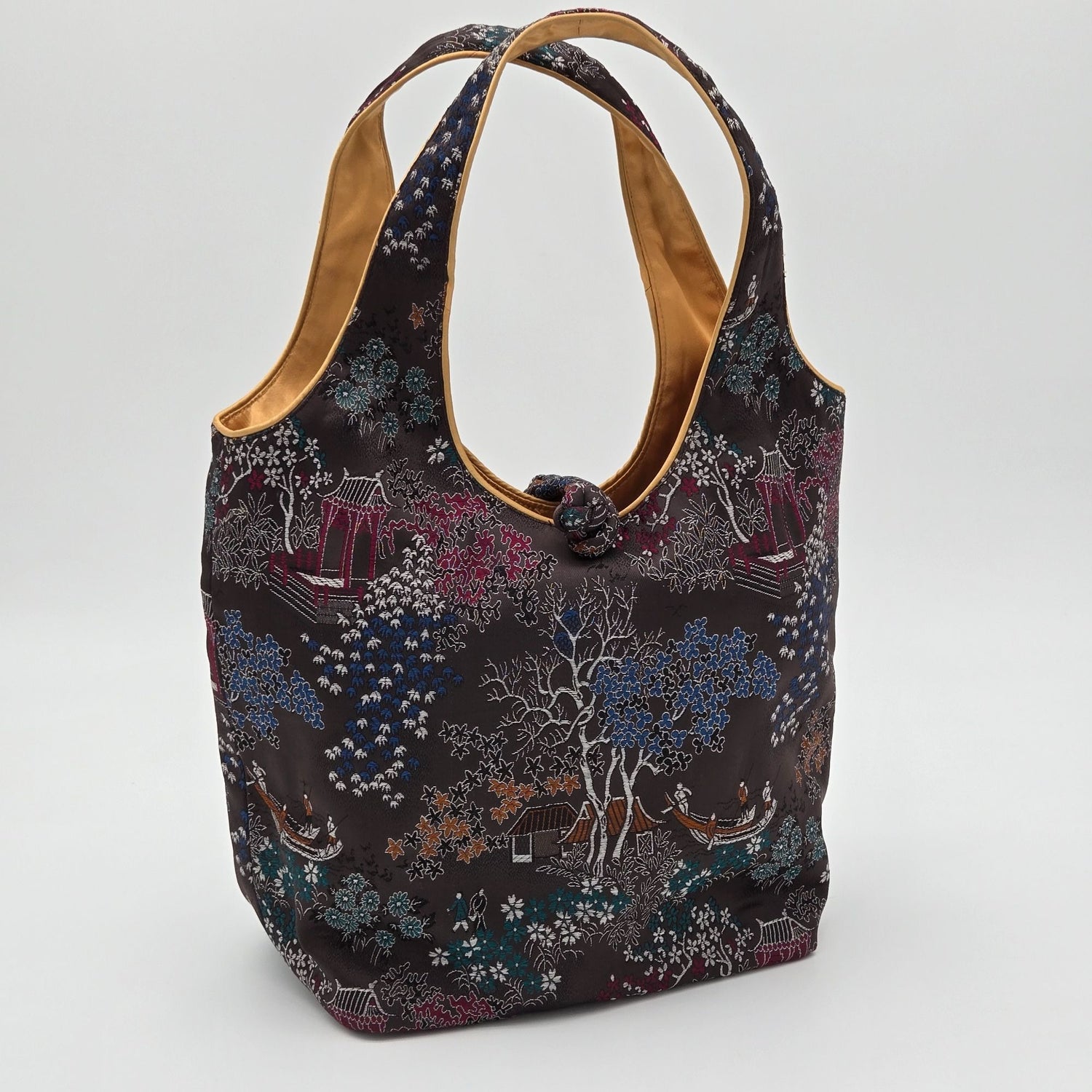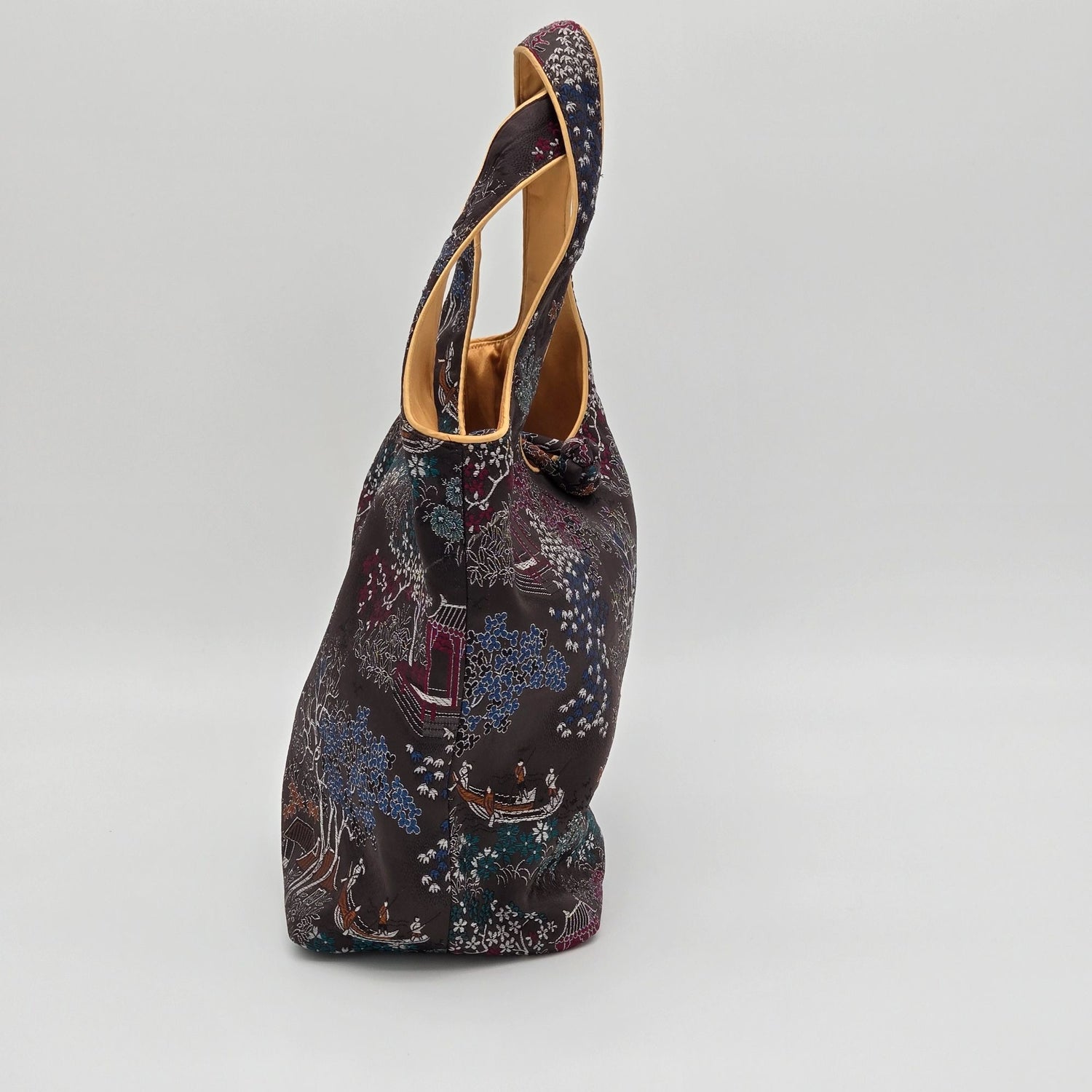 Handmade Mandarin Motif Silk Embroidery Tote Bag With Knot Closure & Inner Pocket