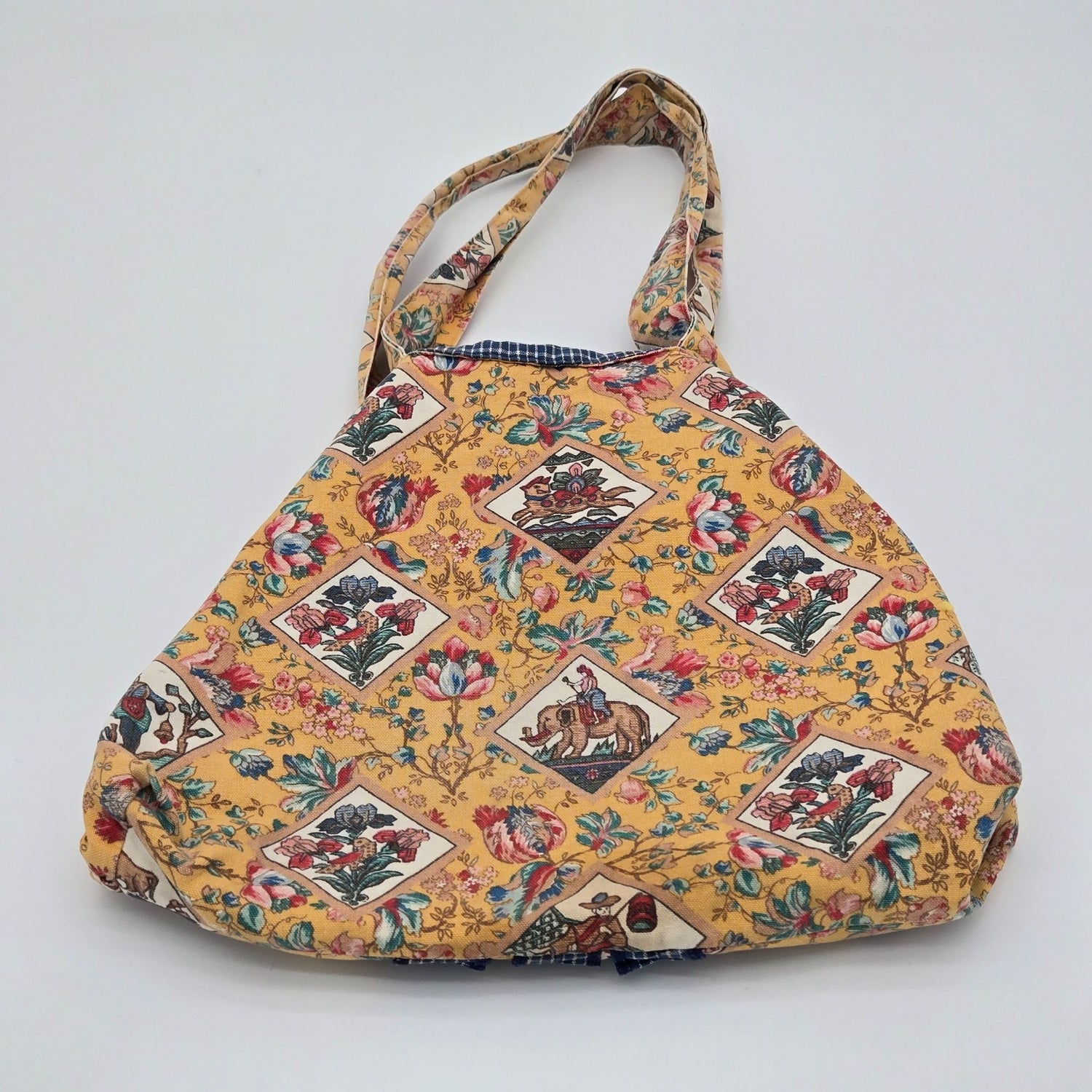 Suzanne Tote Bag With Floral & Checkered Pattern Quilted Cotton Fabric Button Closure Made In USA 16" W X 14" H