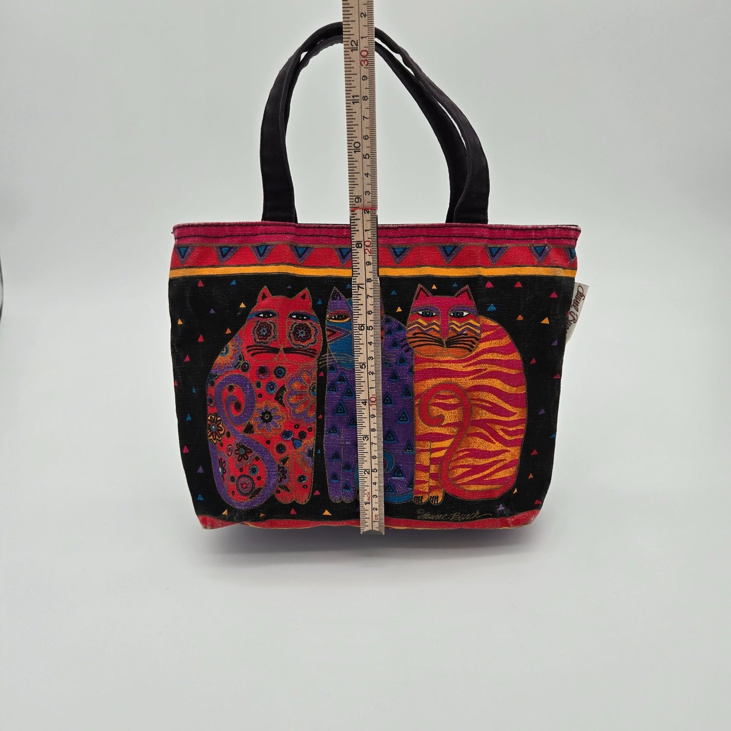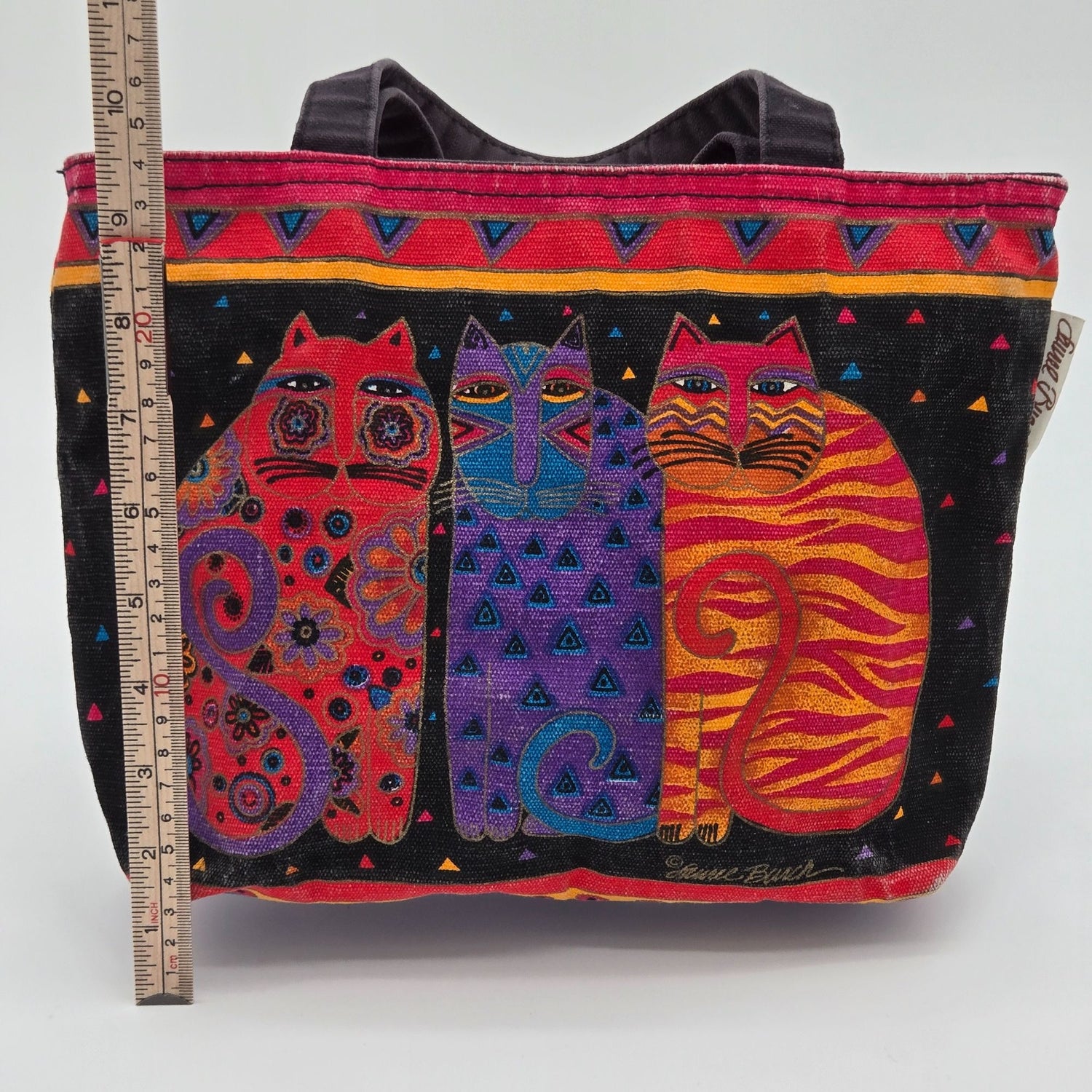 Laurel Burch Colorful Cat Print Canvas Tote Bag With Black Handles is backordered and will ship as soon as it is back in stock.