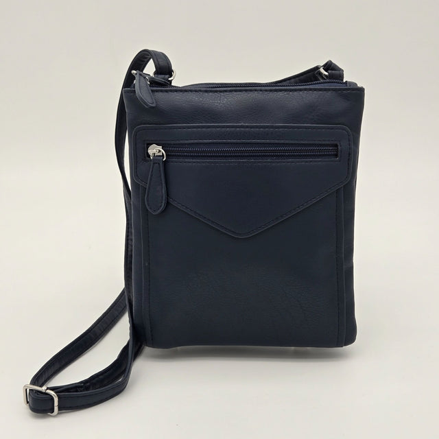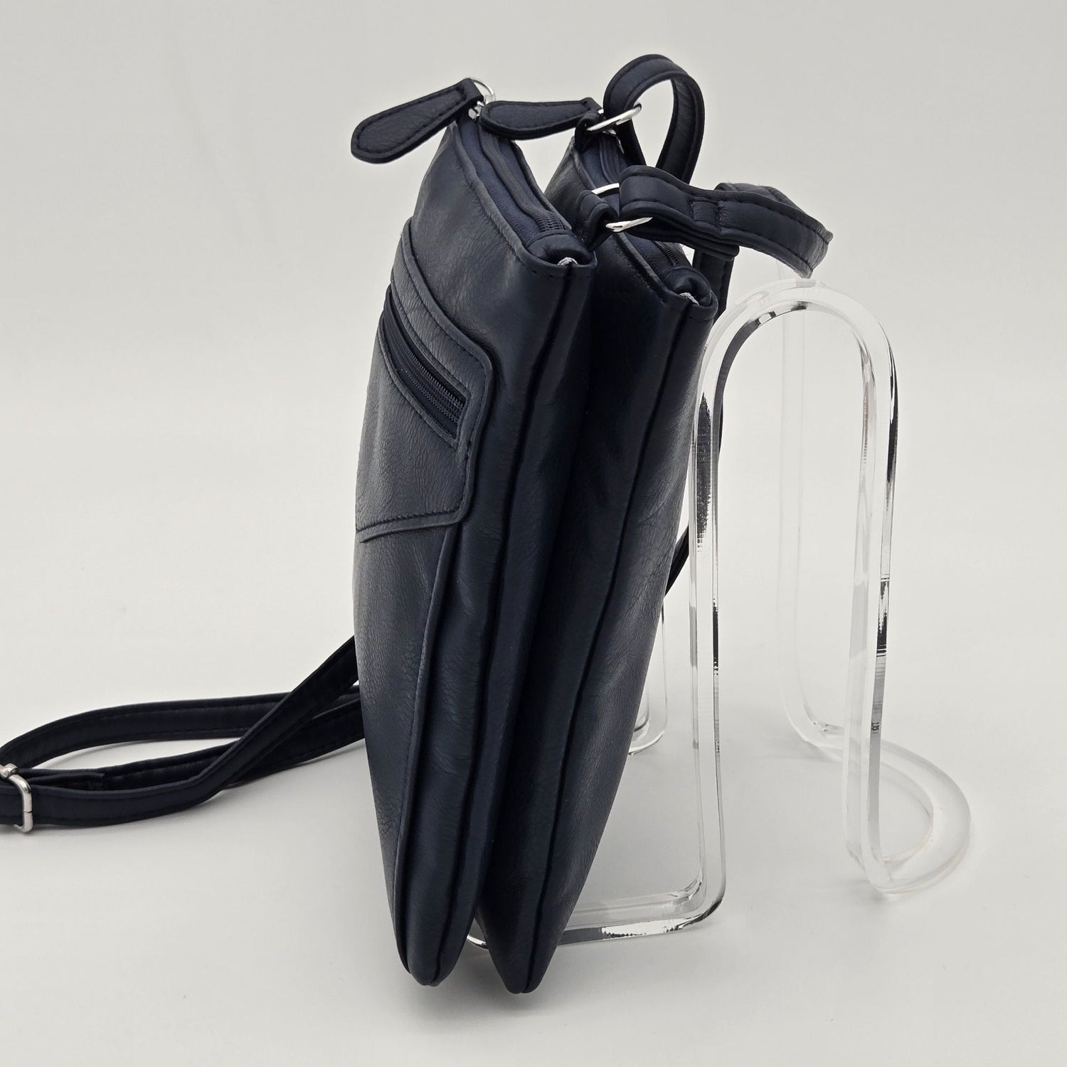 This compact crossbody bag features a sleek navy design with two zippered compartments, ideal for organizing daily essentials on the go.