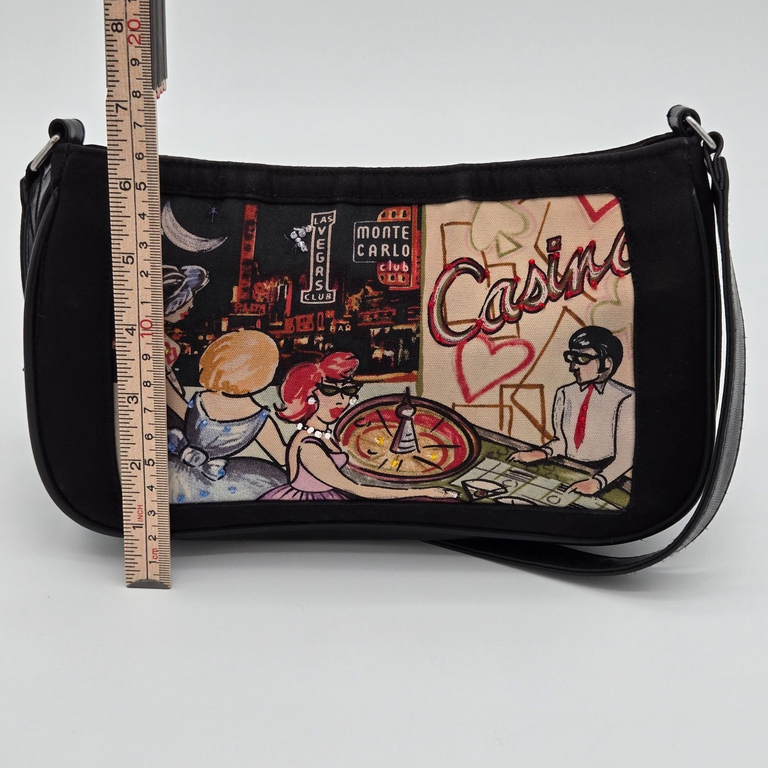 Retro Casino-Themed Black Handbag With Zipper Closure