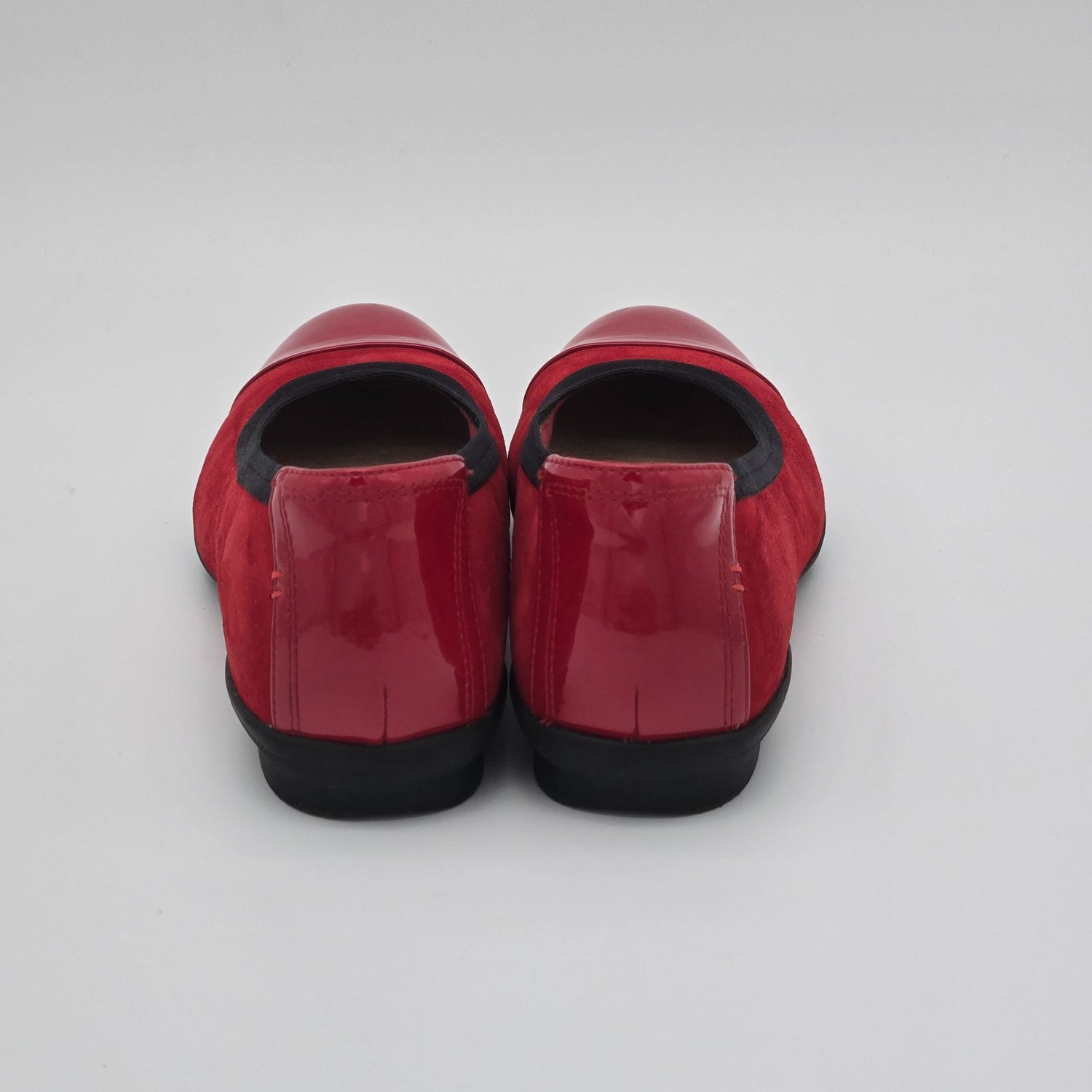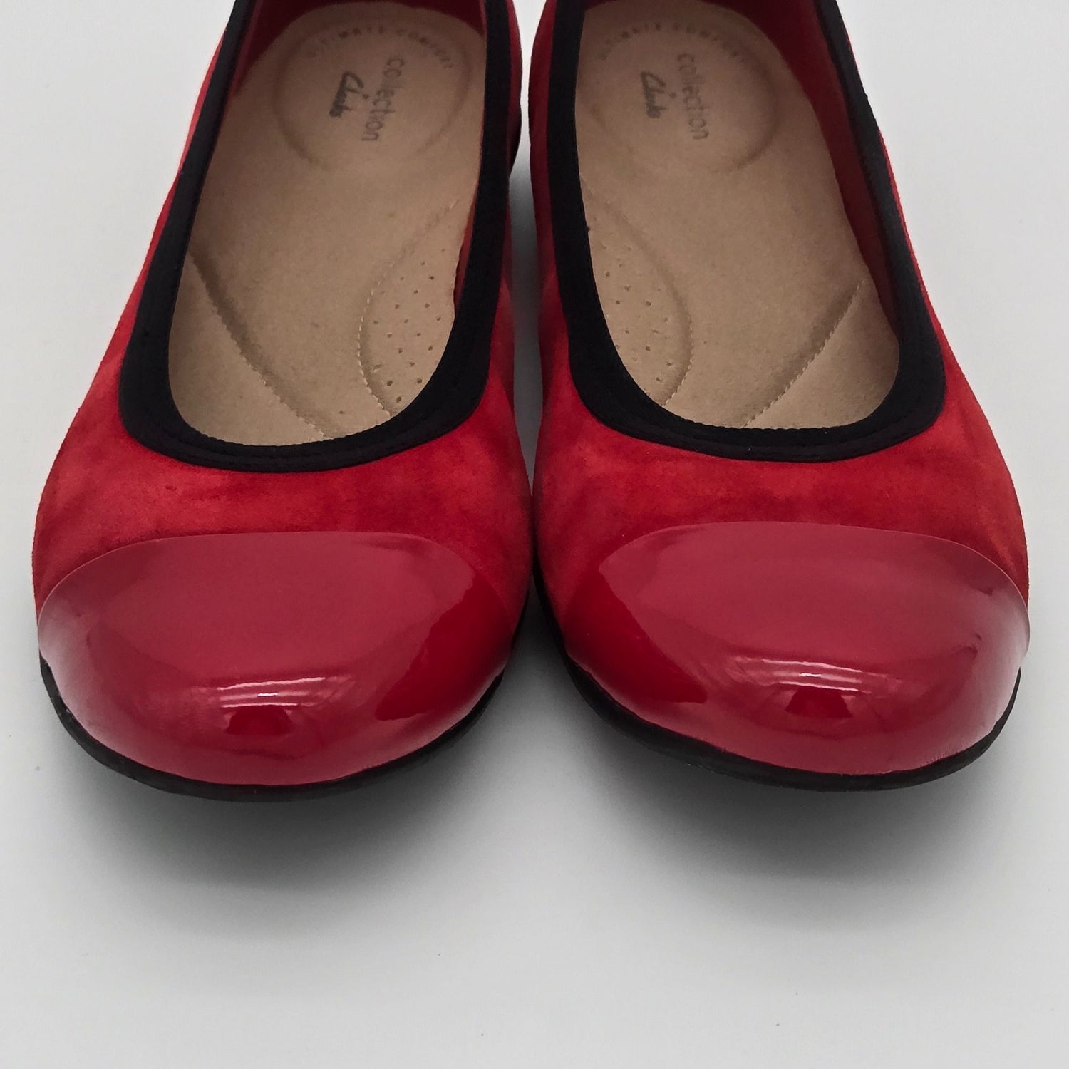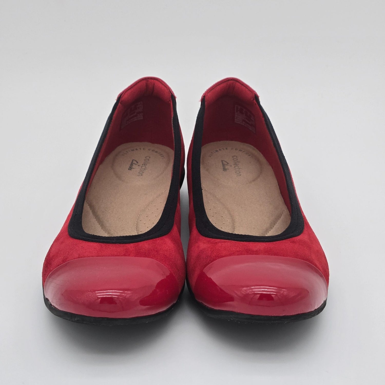 These ballet flats are designed with a chic blend of red suede and patent toe accents. They feature Clarks' Ultimate Comfort for all-day wearability.
